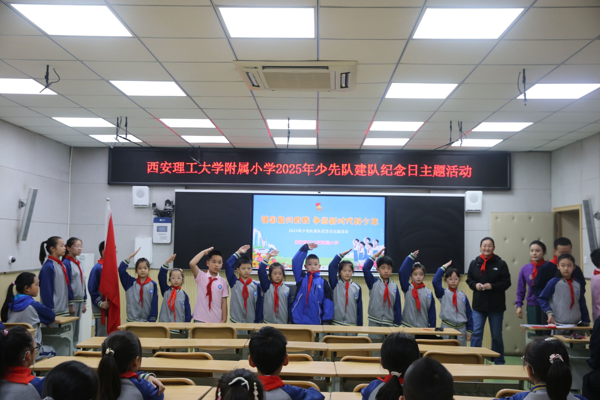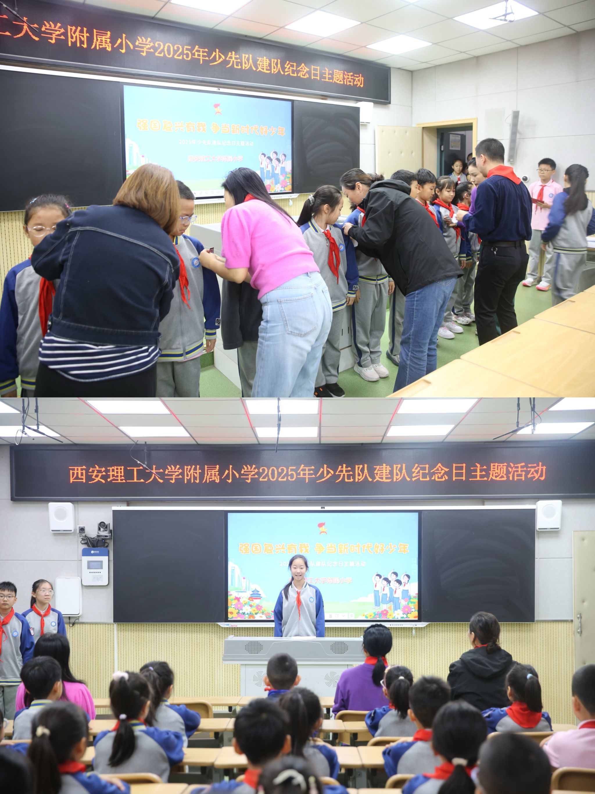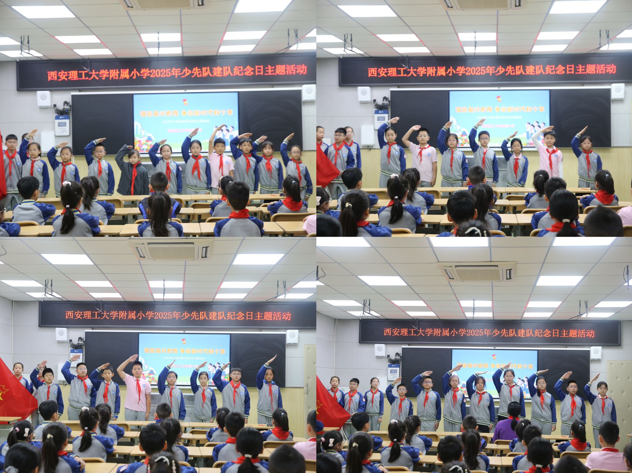 2025年10月13日,在第76个中国少年先锋队建队纪念日到来之际,西安理工大学附属小学以“强国复兴有我,争当新时代好少年”为主题,举办2025年少先队建队纪念日主题活动。附属小学校长曹红侠、副校长张敏、教导主任郭玲、德育主任何琦、少先队大队辅导员耿琦与各年级中队代表齐聚录播教室,在庄重氛围中回溯少先队光辉历程,让红色基因融入少年血脉,让复兴使命扎根童心。