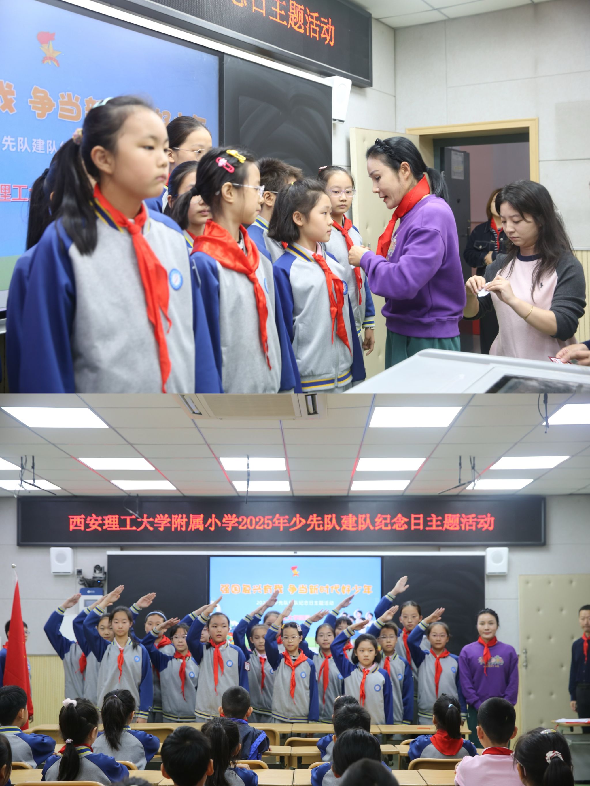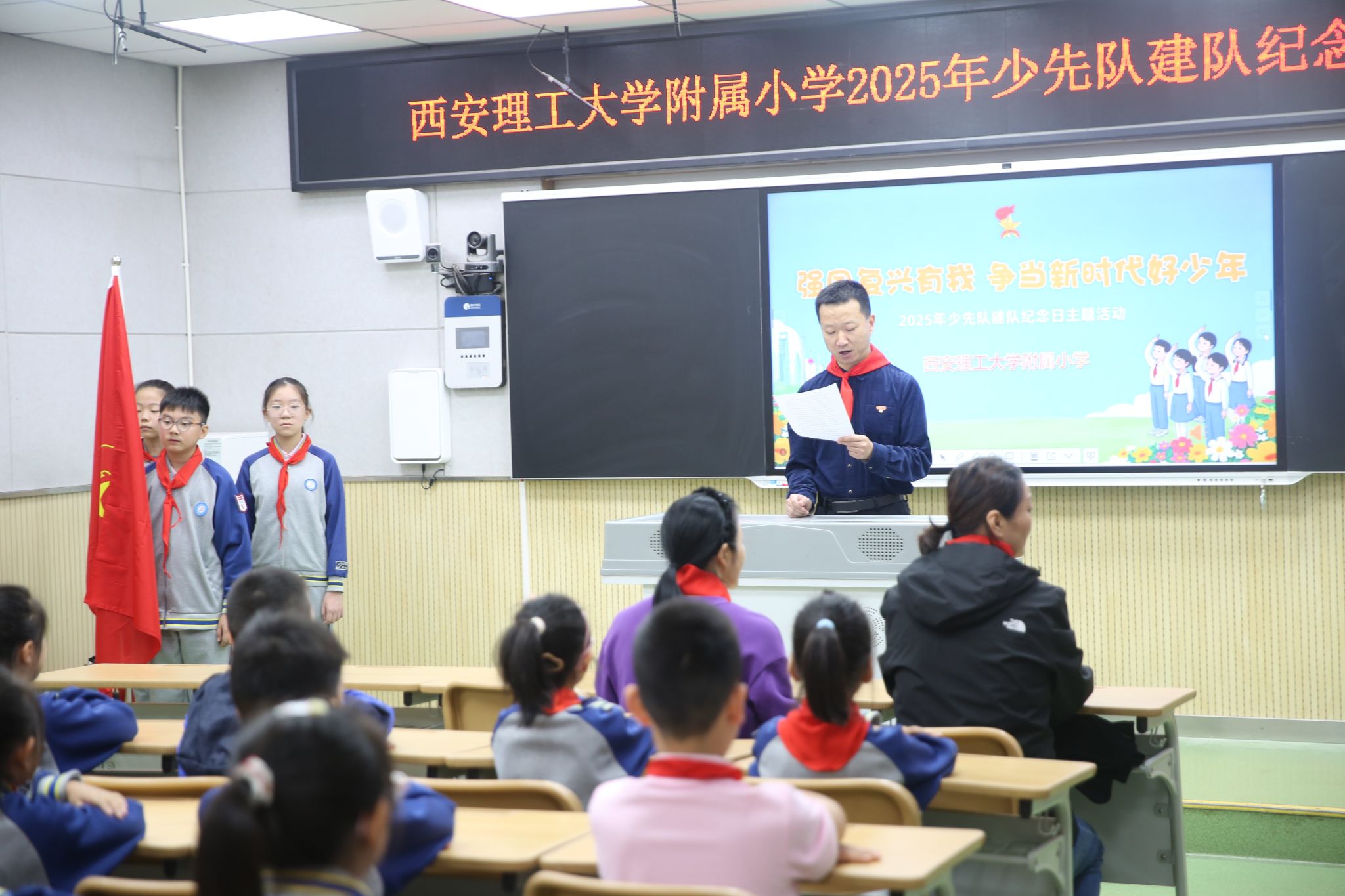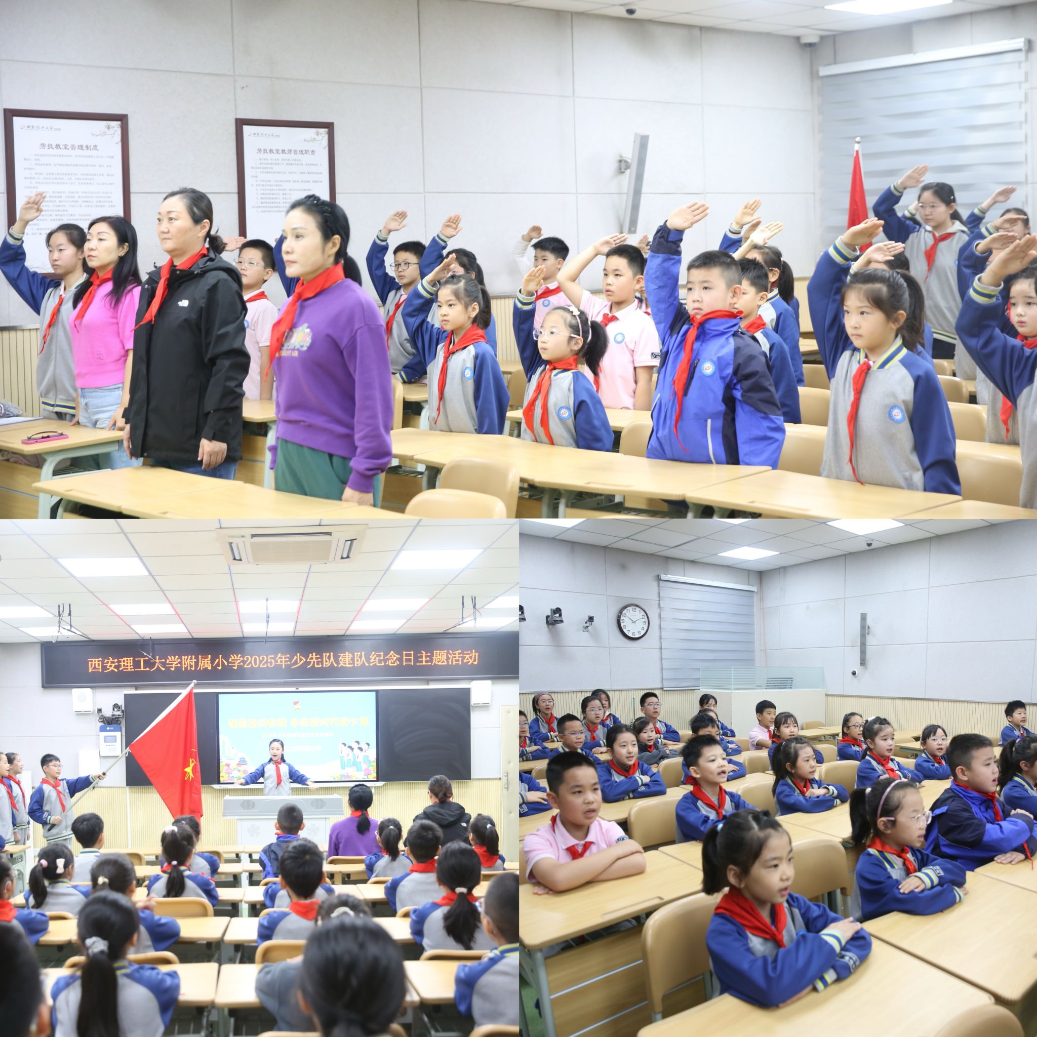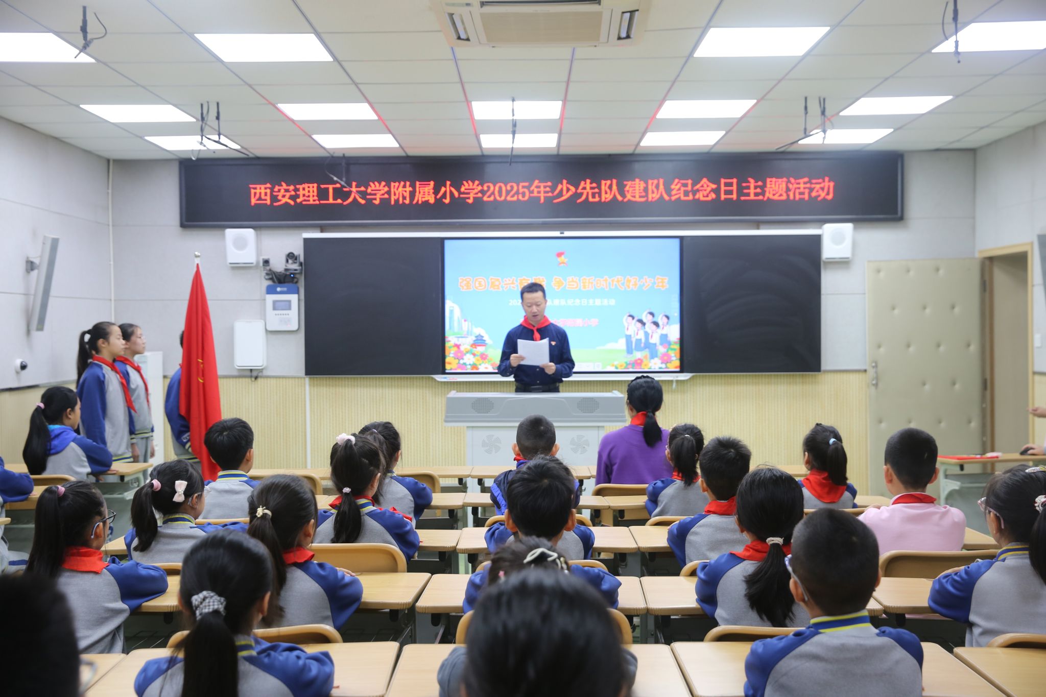 2025年10月13日,在第76个中国少年先锋队建队纪念日到来之际,西安理工大学附属小学以“强国复兴有我,争当新时代好少年”为主题,举办2025年少先队建队纪念日主题活动。附属小学校长曹红侠、副校长张敏、教导主任郭玲、德育主任何琦、少先队大队辅导员耿琦与各年级中队代表齐聚录播教室,在庄重氛围中回溯少先队光辉历程,让红色基因融入少年血脉,让复兴使命扎根童心。
